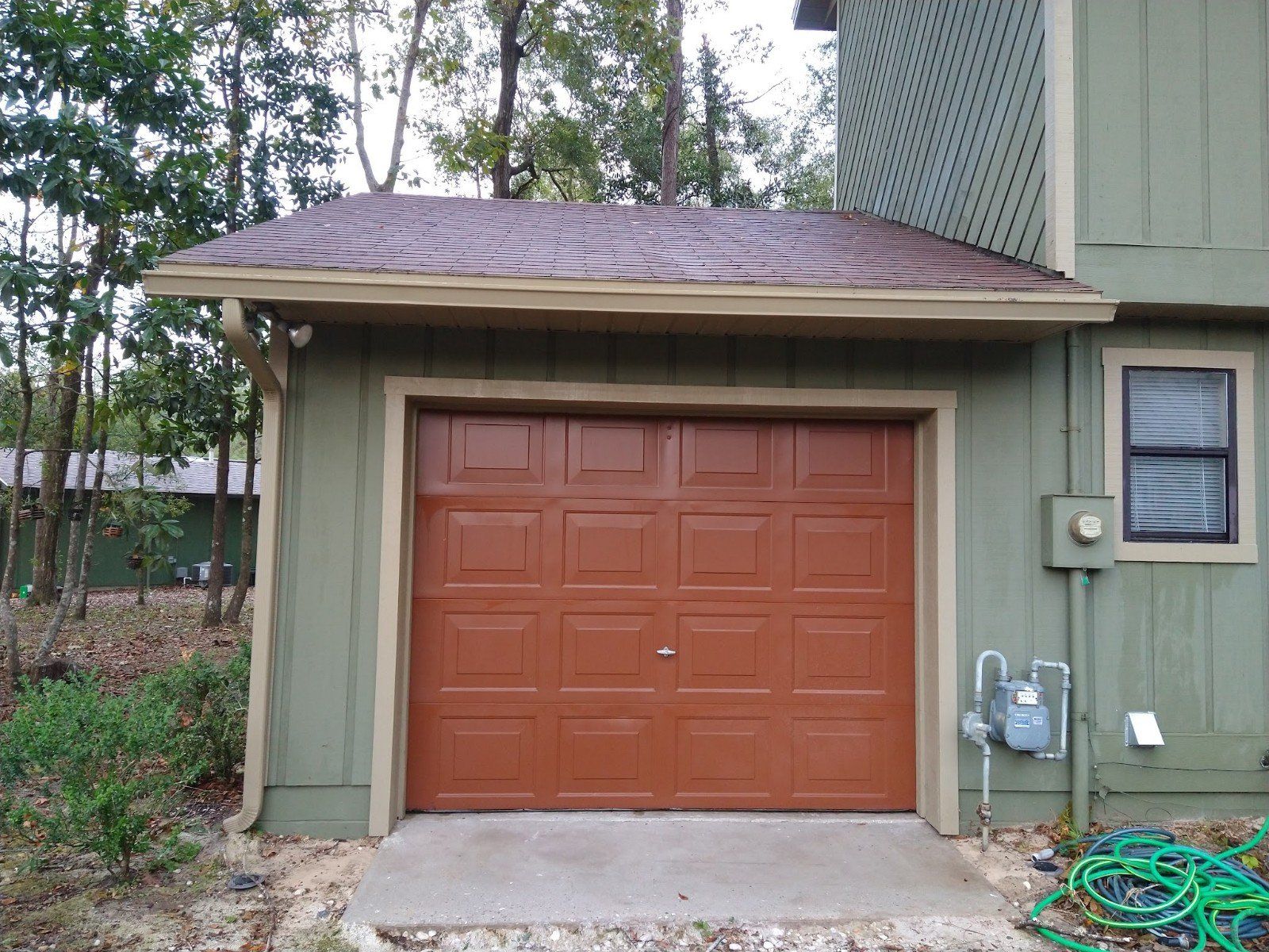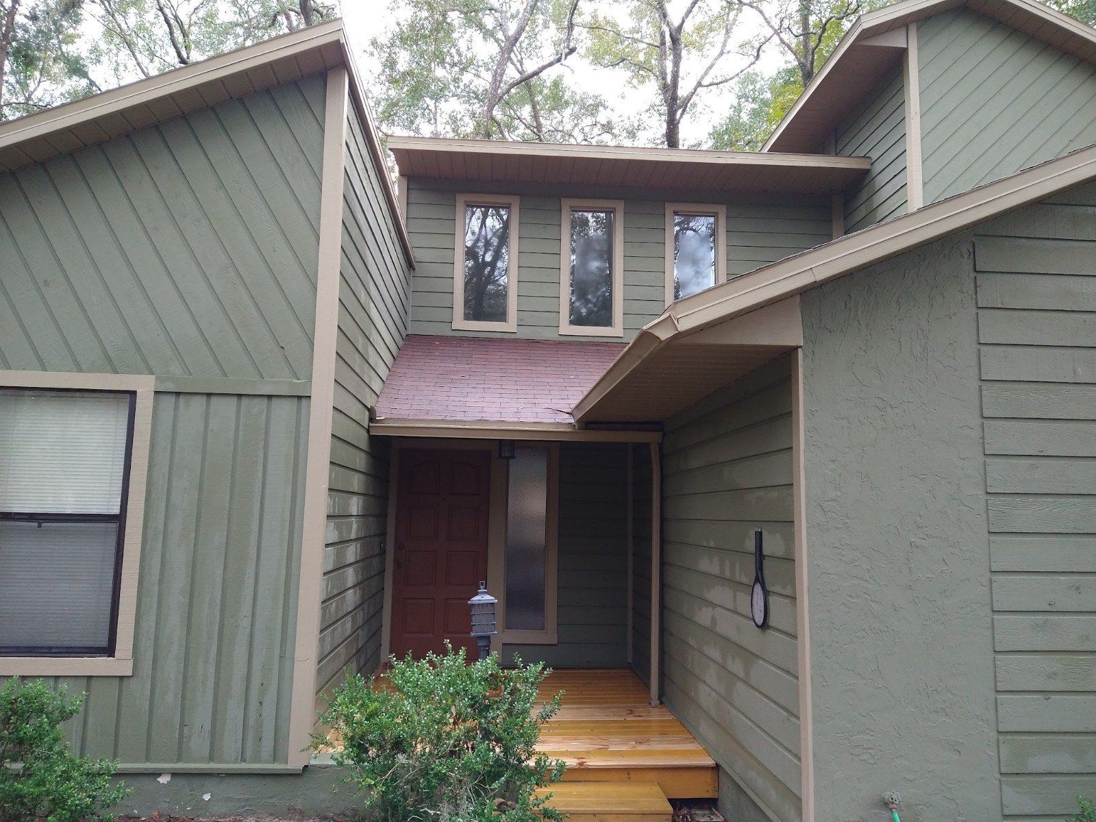 This project was for a house wash, roof cleaning, and gutter cleaning. The house had a partial second floor and the gutters were packed and overflowing. There were a lot of surrounding trees. The house washing and roof cleaning was done by soft washing and turned out great!